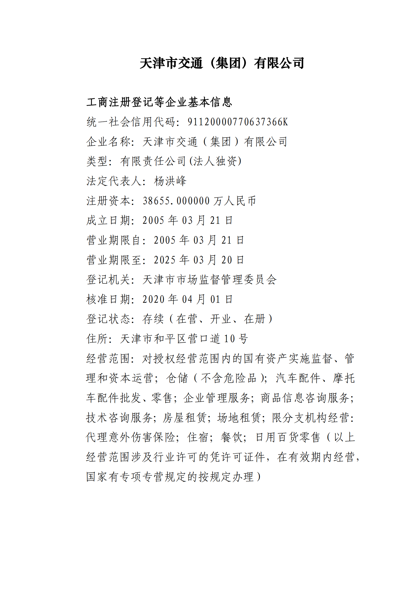 天津市交通(集团)有限公司工商注册登记等企业基本信息